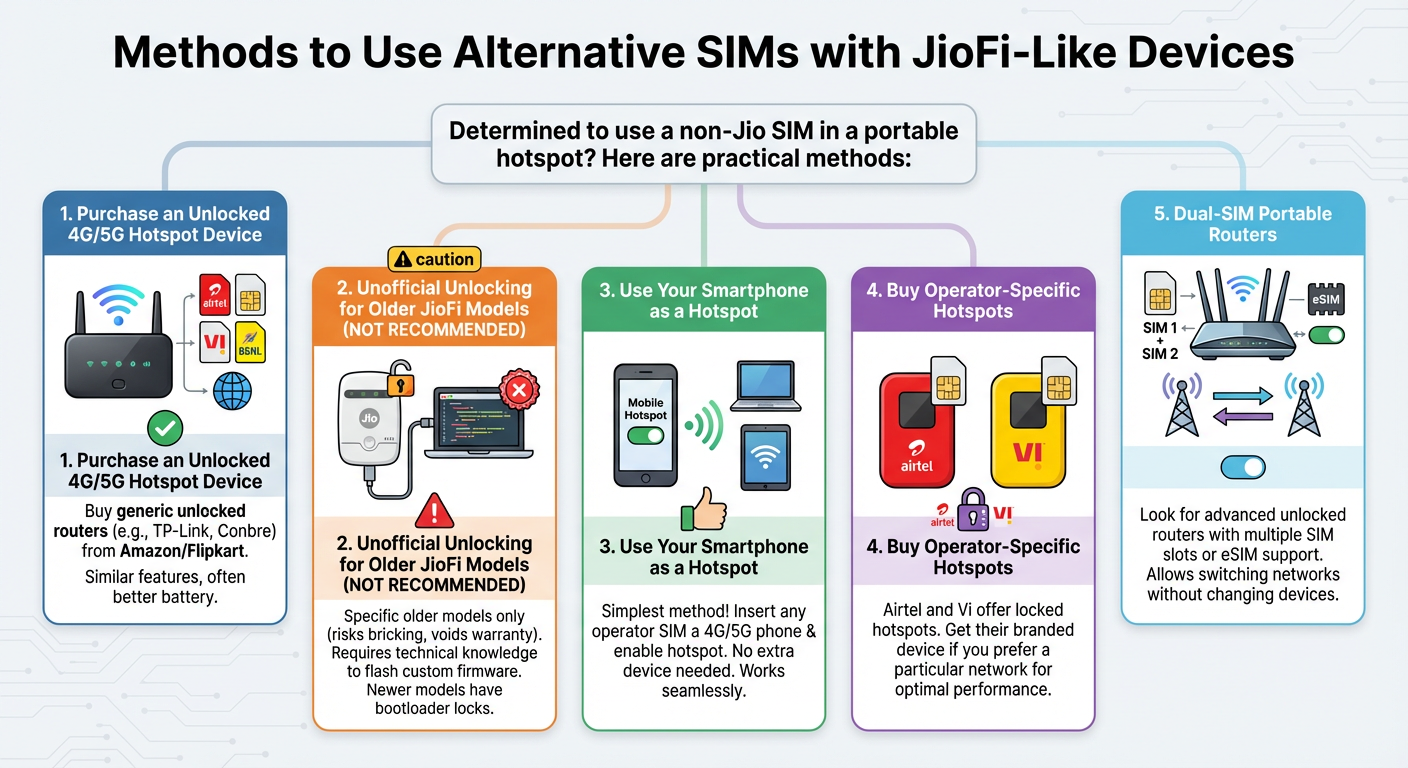 If you’re determined to use a non-Jio SIM in a portable hotspot, here are some practical methods for users: